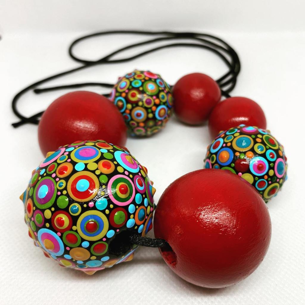 Za izradu nakita najčešće se koriste drvene perle i drugi geometrijski oblici (npr. kocke) različitih dimenzija. Prije oslikavanja definiše se forma ogrlice/narukvice/naušnice, zatim se pristupa oslikavanju koji je u svojoj prirodi najbliži procesu veza, tačka po tačka. Od boja se koriste akrilne boje i lak. Nakon što se akril osuši, nanosi se sloj akrilnog laka radi zaštite i postojanosti boje. Istačkani elementi se zatim slažu sa ostalim elementima zavisno od vrste nakita. Za ogrlice koriste se kratke sajle, duge velur vrpce, kožne ili satenske trake zavisno od želje kupca. Dodaju se ostali elementi i ukrasi (kićanke, perlice, privjesci, itd.). Proces oslikavanja ovom tehnikom je dugotrajan i sve se radi „slobodnom rukom“ bez šablona, sa puno ljubavi i strasti.
