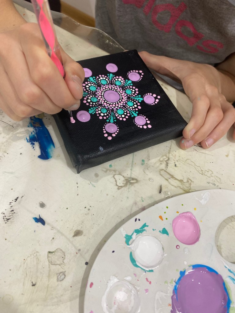 DOTS organizuje kreativne radionice tačkanja za djecu uzrasta od 7 do 14 godina, u malim grupama do 8 polaznika. Radionice su pažljivo osmišljene kako bi djeca kroz igru i zabavan rad: