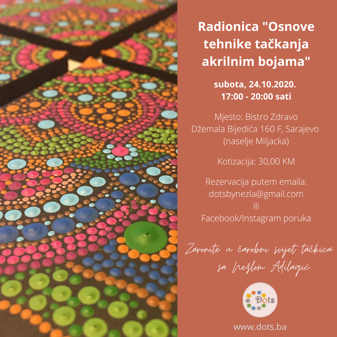 Subota, 24.10.2020. od 17:00 do 20:00, Bistro Zdravo ul.Džemala Bijedića 160 F, Sarajevo DOTS organizuje drugu radionicu ove godine gdje će polaznici imati priliku naučiti o osnovama tehnike tačkanja akrilnim bojama, o alatima i medijima na kojima se tačka, kao i ponešto o istoriji i porijeklu ove tehnike i mandalama, koja će biti motiv oveNastavi čitati “DOTS organizuje radionicu “Osnove tehnike tačkanja akrilnim bojama””