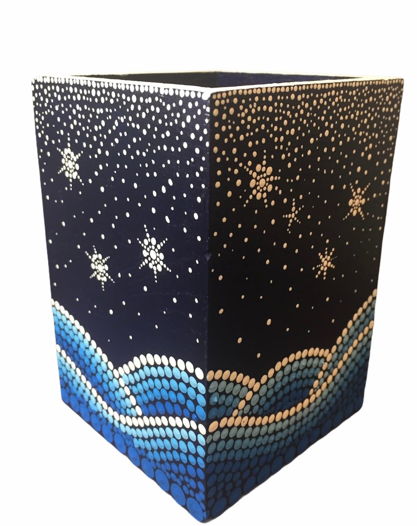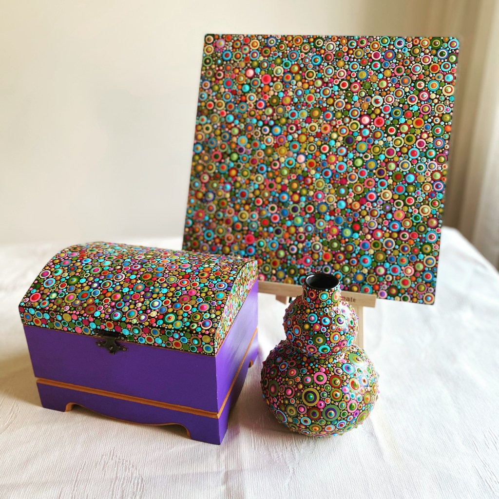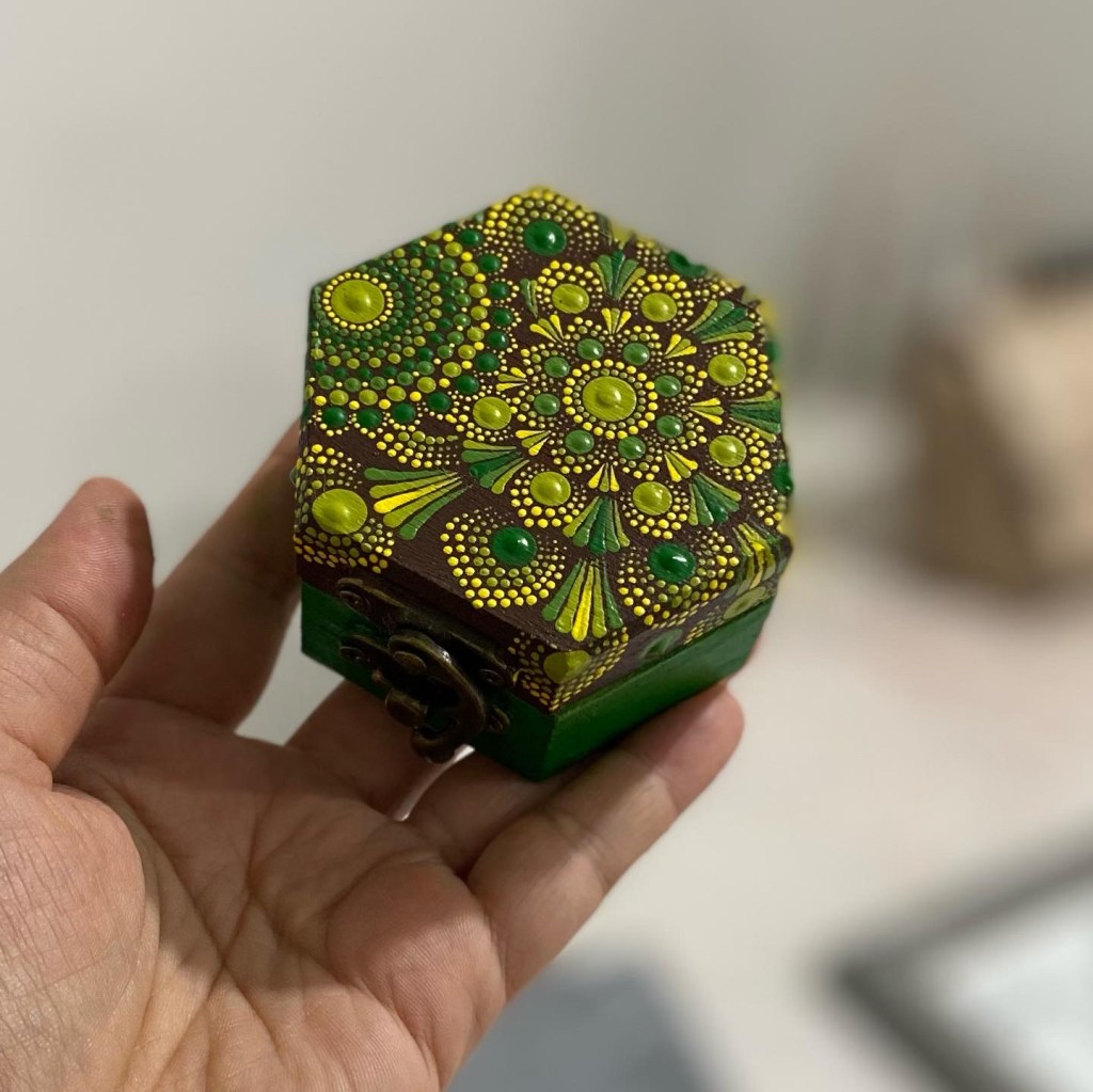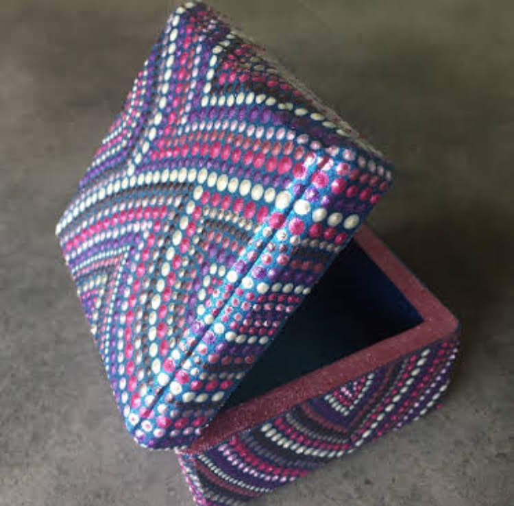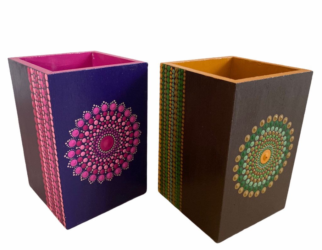 DOTS dekorativne kutije, okviri za slike, stalci za olovke i slični predmeti izdvajaju se po svom jedinstvenom dizajnu i pažnji posvećenoj svakom detalju. Svaki komad se ručno oslikava tehnikom tačkanja – i sa vanjske i sa unutrašnje strane – čime se svaki predmet pretvara u malo umjetničko djelo.