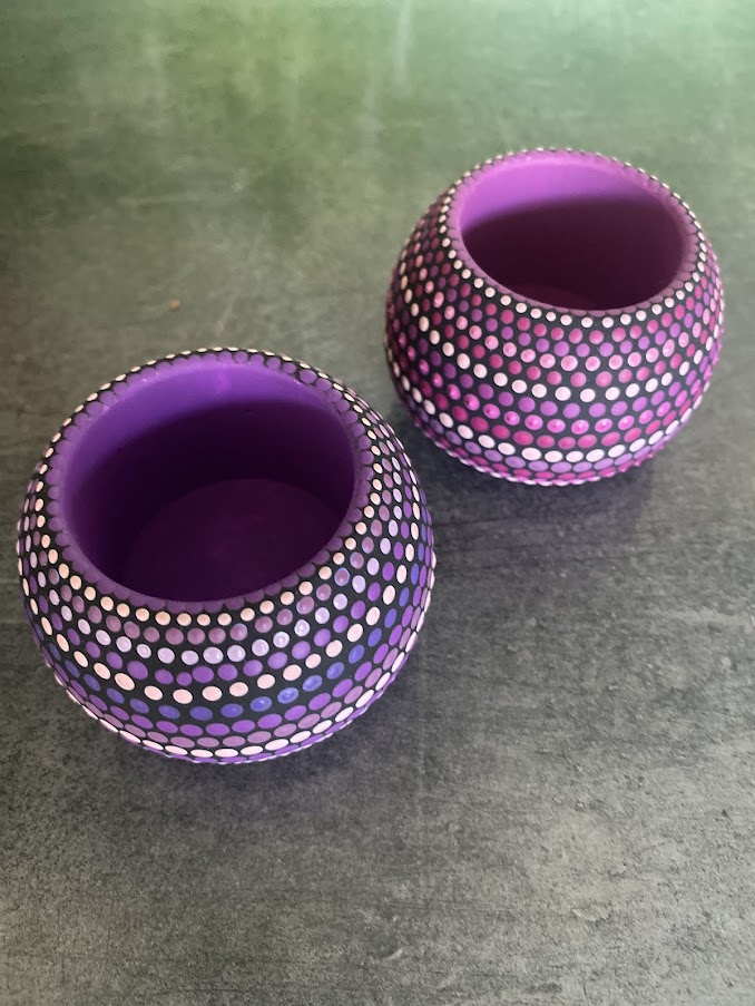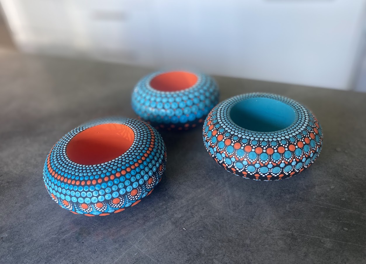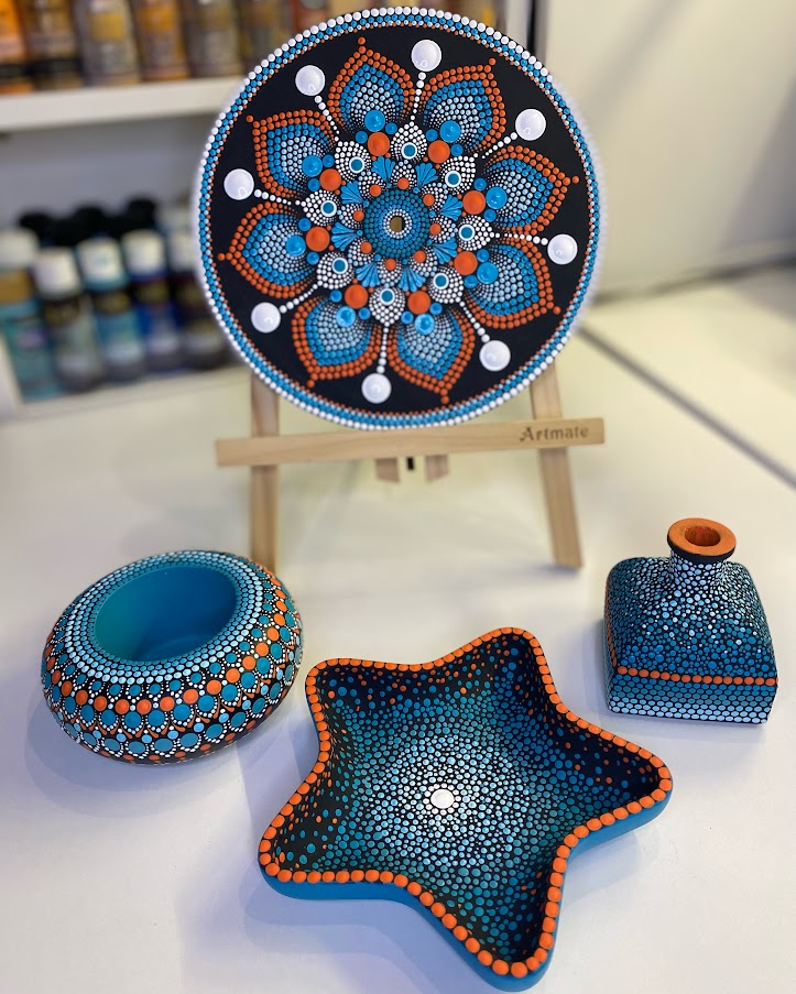 U DOTS radionici izrađujemo jedinstvene gipsane dekorativne predmete koji nastaju pomoću kalupa, kombinirajući preciznu izradu i umjetnički dizajn. Nakon oblikovanja, svaki predmet pažljivo se oslikava tehnikom tačkanja, stvarajući bogate, šarene uzorke koji ističu detalje i daju život svakoj površini.